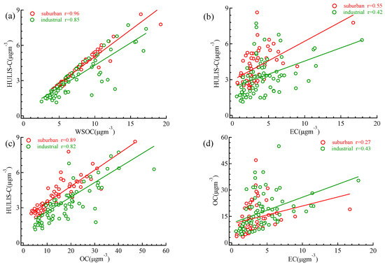 Figure 5a–c show the correlation scatter plots of HULIS-C vs. carbonaceous components (WSOC, OC, and EC) at the two sites. Moreover, the scatter plots of OC vs. EC are also presented in Figure 5d. The observed highly positive correlations between HULIS-C, WSOC, and OC demonstrated that three species share common sources. Further, we attempted to find the correlation between HULIS-C and primary emissions, such as EC (mainly produced from combustion sources and as a representative primary emission indicator). As presented in Figure 5c, the correlation between HULIS-C and EC was weak, especially in the industrial region, indicating that EC was actually not an influential source of HULIS-C, implying vehicle emissions were not the main source of HULIS. A weak correlation between OC and EC showed their distinct sources. According to Table 1, in our study, the mean OC/EC ratio was about 5.0 (4.87 in the industrial region and 4.97 in the suburban region). The average OC/EC ratio was significantly higher on polluted days (6.28) than on fair days (3.57) at the suburban site. Conversely, no distinct difference was found in the industrial region (O/C = 4.47 on fair and 5.06 on polluted days), which might be explained by high primary emissions such as PAHs and EC [43] and relatively small contributions from secondary sources on polluted days.