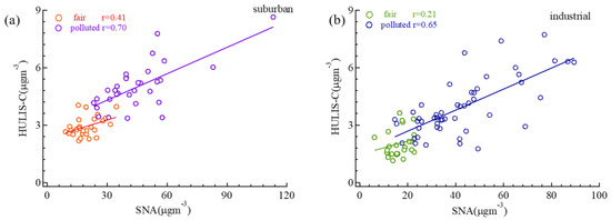 Correlations between HULIS-C concentration and secondary inorganic ion (SNA = NH4+ + NO3− + SO42−) concentration in industrial (a), and suburban (b) regions.