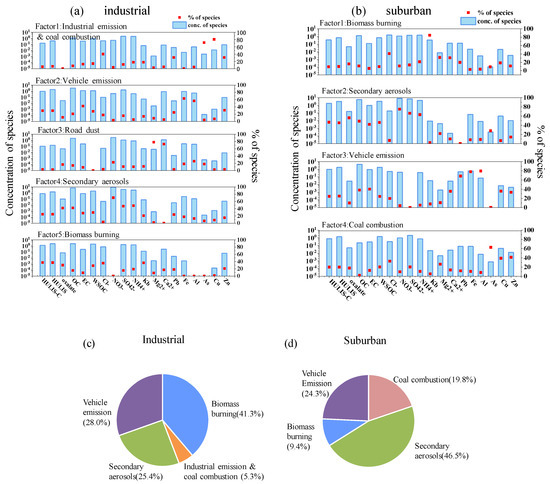 Finally, we selected a four-factor solution for the suburban region and a five-factor solution for the industrial region as the final optimal PMF results by performing 100 bootstrap runs, with more than 90% of the runs producing the chosen solutions. Theoretical Qtrue and Qrobust displayed a <5% difference. As stated before, the extra modeling uncertainty was set to 5%. Scaled residuals of >95% data were in the range of −3 to 3. A good correlation was found between model-apportioned HULIS-C (industrial: r = 0.97; suburban: r = 0.92), OC (industrial: r = 0.90; suburban: 0.90) and WSOC (industrial: r = 0.91; suburban: r = 0.92) with real measured concentrations.