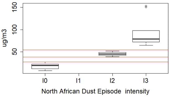 Based on analysis of PM10 daily time series (2005–2016), an index was empirically derived from the 24-h mean values of PM10 to define days without or with NADE: I0 (no NADE) if PM10 ≤ 27 µg/m3, I1 (light NADE) if 27 < PM10 ≤ 38 µg/m3, I2 (moderate NADE) if 38 < PM10 ≤ 54 µg/m3, and I3 (intense NADE) if PM10 > 54 µg/m3.