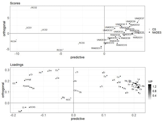 The characteristic variables of each of these three clusters provided a first picture of the chemical compounds discriminating NADE samples from CS, as well as urban from rural samples. The CS cluster is mainly characterized by higher than means levels for Cr, Se, OC, diff-Cl, SO42−, diff-Na, levoglucosan, and pyrene. Samples from the rural NADE cluster are characterized by higher than overall mean concentrations for the elements Sr, diff-Mg, and PAH compounds are less frequently detected in samples from this cluster than in all samples. The urban NADE cluster is characterized by levels higher than overall mean concentrations for Al, Be, Ce, Cd, Co, Cs, Dy, Er, Eu, Fe, Gd, La, Mn, Nd, Pb, Pr, Th, U, Rb, Sb, Sc, TI, V, NO3−, diff-K, and PAH compounds (benzo[a]anthracene, benzo[a]pyrene, benzo[b]fluoranthene, benzo[e]pyrene, benzo[g,h,i]perylene, benzo[k]fluoranthene, chrysene, coronene, fluoranthene, indeno[1,2,3-cd]pyrene, and retene) more frequently detected in samples from this cluster than in all samples. Therefore, the OPLS-DA analysis was applied to the modified dataset resulting from the re-qualification of one of the rural control sample as a rural NADE sample. It confirmed the existence of a difference in chemical composition (Figure 4), essentially observed between groups (NADE and CS); 77% of the data inertia being represented by the first component. It also confirms through the second component the FAMD analysis results, with a greater dispersion within the CS, vs. a lower dispersion in the samples taken during an NADE, respectively, in rural and urban areas.