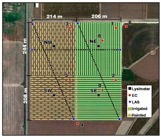 Four precision weighing lysimeters [30], 3 × 3 × 2.3 m deep, were used to measure the cotton ET. Each lysimeter contained a monolithic Pullman clay loam soil core. The lysimeters were located at the center of four fields (210 m east–west by 225 m north–south), two (east) of which were irrigated by a linear move system, and two (west) of which were not irrigated. The change in the lysimeter mass was measured by a load cell (SM-50, Interface, Scottsdale, AZ, USA) and recorded by a datalogger (CR7-X, Campbell Scientific Inc., Logan, UT, USA) at a 0.17 Hz frequency. The high frequency load cell signal was averaged for 5 min and composited to 15-min means. The lysimeter was calibrated as explained in Howell et al. [2]. A simple soil water balance using the change in water storage from four neutron probes, irrigation, and precipitation data showed that the northeast (NE) lysimeter had a larger ET than the surrounding field [31]. According to that study, the ET measurements from the NE lysimeter were 18% larger than the surrounding field from Day of Year (DOY) 182 to 220, as determined by a soil water balance using the neutron probe soil water content readings, due to the greater leaf area index (LAI) on the lysimeter than the surrounding field. Therefore, the NE lysimeter ET measurements, from that period, were reduced by 18% in order to ensure that they were representative of the entire field, as indicated by Evett et al. [31]. Pictures of a lysimeter box and an EC system are shown in Figure 1.