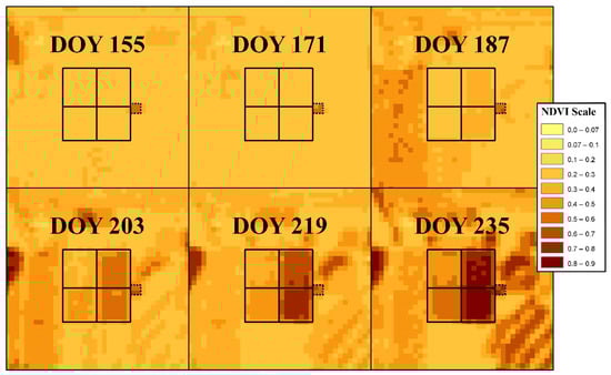 NDVI maps with the lysimeter fields (solid lines) and weather station grass field (dotted lines) boundaries shown for DOYs 155, 171, 187, 203, 219, and 235, derived from reflectance images courtesy of the U.S. Geological Survey.
