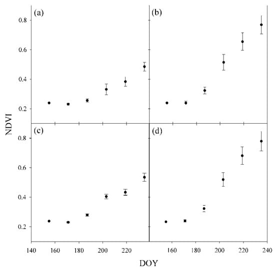 Mean NDVI with standard deviation (bars) for the (a) NW, (b) NE, (c) SW, and (d) SE fields on DOYs 155, 171, 187, 203, 219, and 235.