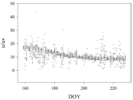 During the early growth stage, the surface roughness is very small. The KM01 uses wind velocity, u, instead of the roughness length, z0 [55]. Under ideal conditions, the use of u and z0 are equivalent, as they are related. The advantage of using u is that it is measured in situ, along with the other input parameters, whereas the z0 is derived using the Monin–Obukhov similarity theory or estimated using empirical relationships with the canopy height. The size of the KM01 footprint is heavily dependent on the ratio of u/u*, which is interpreted as the relative strength of the horizontal advection vs. vertical diffusion [55]. As shown in Figure 5, the u/u* was higher during the early growth stage, decreasing steadily until about DOY 200, where it mostly leveled off. The higher u/u* is why the footprint extended farther upwind during the early growth stage, which is the reason why less of the footprint was within the field of interest, as shown in Table 5.