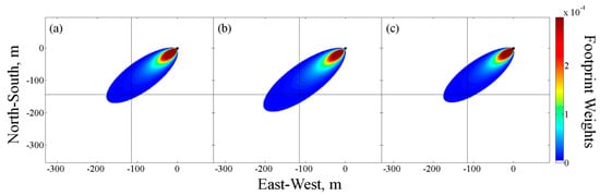 Contour plots of footprints at EC1 using the (a) S90, (b) H2000, and (c) KM01 models during unstable stratification on DOY 195 at 14:30 am CST.
