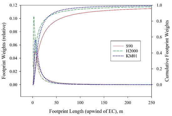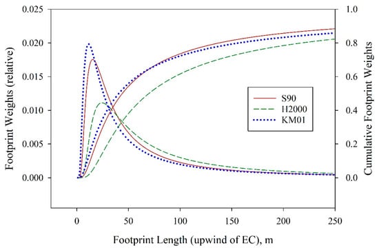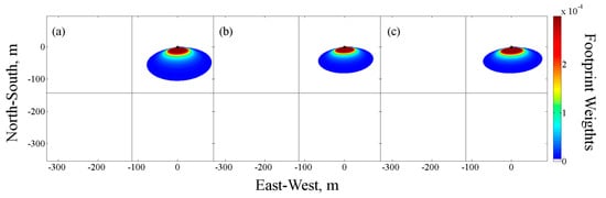 The difference in each footprint model under both stable and unstable atmospheric conditions is shown in Table 6. For the stable condition, the S90 performed better, with an MBE of −0.03 mm h−1 (−3.16%) and an RMSE of 0.12 mm h−1 (12.75%). However, Figure 6 and Figure 7 show that the S90 and KM01 models yielded similar shapes, whereas the H2000 model has a wider and longer overall footprint, with a smaller concentration near the tower. For the unstable condition, all three models performed similarly, and considerably better than the stable condition, with the RMSE ranging from 0.05 to 0.07 mm h−1 (7.20 to 9.13%), which is consistent with the shapes of the footprint illustrated in Figure 8 and Figure 9. However, it should be noted that all of the models did show strong influence close to the tower, especially for the unstable atmospheric condition. Because a more accurate estimate of the ET was obtained using the lysimeters in the east fields compared to the west fields in which the EC systems were used, the ETcomposite for the unstable condition should be more accurate as well.