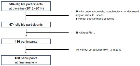 Of 504 eligible participants, 26 who had pneumoconiosis, bronchiectasis, or tuberculous destroyed lung on chest CT scans, 4 who had no questionnaire, and 74 who had no PM2.5 data were excluded. Finally, 400 participants were analyzed (Figure 1). Their mean age was 71.7 years (Table 1). Most participants were men (N = 301, 75.3%). Most subjects were ex-smokers or current smokers (N = 264, 66%). The average smoking amount was 18.4 pack-years. Mean FEV1/FVC was 0.65 ± 0.11. CAT score was 16.0 and mMRC dyspnea scale score was 1.37. Seventy patients had a previous history of asthma. The emphysema index of the whole group was 6.63 ± 0.70. The mean wall area was 68.8 ± 5.2 (Table 1). Additionally, baseline characteristics of normal healthy volunteers are shown in Table S5.