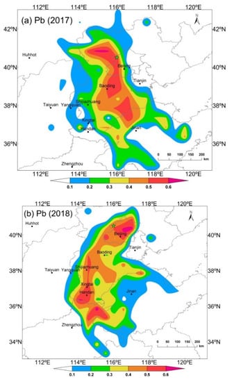 In addition, we further investigated the relative contribution of air mass transport paths between years, taken Pb for example. As shown in Figure 5, the potential source regions of Pb differ between years. In 2017, the hotspot sources referred to the surrounding NW and S areas, which is approximately 100 km from observation site. However, the hotspot source regions to the NW disappeared in other years. The contribution from NW areas may be the reason why the bulk deposition of Pb is higher in 2017. A unique feature also occurred in 2019, when the potential source regions were mainly identified to the far away NE. In 2018 and 2020, the PSCF analysis suggested a wide distributed sources covering the North China Plain. Considering the declining trend of particles in the region (Figure 4) and the fact that aerosol Pb existed entirely in fine particles [6], further reduction of bulk Pb deposition can be expected in future.