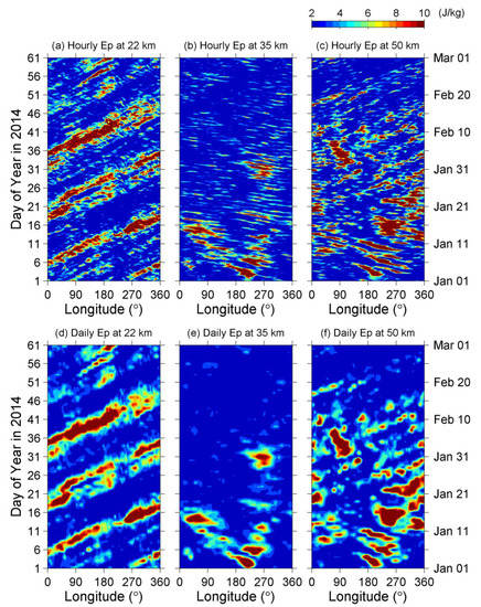 (a–c) The hourly gravity wave potential energy, EP, and (d–f) the daily mean EP at 22, 35, and 50 km altitude, respectively, during the period from 1 January to 1 March 2014.