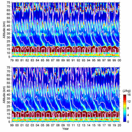 Secondly, we look at 20–35 km altitude in the lower stratosphere. High EP regions are mainly distributed near and below the westerly shear. The EP values around the easterly shears are also slightly higher than the quiet background although this feature is not apparent in the figure. In contrast, the EP values during the westerly and easterly regimes (where and when the westerly/easterly wind prevails) are much lower than those around the zero-wind shears. EP in the lower stratosphere is significantly correlated with the zonal wind, which implies the existence of wave–mean flow interactions. We can further speculate that the high EP around the westerly and easterly shears could be mainly caused by Kelvin waves and Rossby–gravity waves, respectively, since both waves have significant contributions in driving the QBO of zonal wind [12]. We noticed that the EP contributed by Rossby–gravity waves is much smaller than Kelvin waves. This discrepancy comes from the differences between the amplitudes of Rossby–gravity waves ( is about 1 K in the lower stratosphere) and Kelvin waves ( is about 2–3 K) [10]. Besides, the wave activity tends to enhance from the late 1990s. The probable reason for this enhancement is the warming of sea surface temperature (SST), as reported in [54].