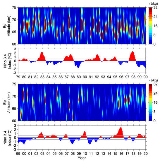 Lastly, between 50 and 60 km altitude in the lower mesosphere, EP is very low, where the westerlies prevail most all the time. However, between 60 and 75 km altitude, EP becomes very large around but mainly above the zero-wind shears, where the zonal winds are easterly. We noticed a large difference in EP between the years before and after 2000. EP values are larger in the former period (the top panel of Figure 2) than in the latter period (the bottom panel of Figure 2). We suppose that this is not a real climatic change phenomenon since a large temperature bias in the lower mesosphere in the ERA5 dataset has been reported for the former period [68,69]. Also, the number of assimilated mesospheric data into ERA5 has a remarkable increase around 2001 (Table 14 in [56]), impacting the data reliability of mesospheric temperature. In spite of this, we retain the discussion on the mesospheric results for recognizing this problem regarding data stability and variability. The EP at 60–75 km altitude from late 2010 to 2014 is lower than that in other years. We also noticed that a La Niña event occurred in 2010–2012, and the Niño 3.4 index was mainly negative during the low EP period. The Niño 3.4 index is a specialized SST index used to monitor the evolution of El Niño/La Niña events. An El Niño/La Niña episode is defined when the 3-month smoothed Niño 3.4 index reaches the threshold of +/- 0.5 °C for several (usually five) consecutive months. Figure 3 shows the same EP values between 60 and 75 km altitudes along with the 3-month smoothed Niño 3.4 index issued by the Climate Prediction Center (CPC) of the National Oceanic and Atmospheric Administration (NOAA) [70]. It is seen that the EP values are larger during positive Niño 3.4 months than during negative Niño 3.4 months. In addition, the peak altitude of EP is higher during positive Niño 3.4 months and lower during negative Niño 3.4 months. A relationship between the Niño 3.4 index/El Niño events and Kelvin wave activities in the stratosphere has been studied by [71]. They found that Kelvin waves are enhanced during El Niño episodes. A special case during the 2009–2010 El Niño episodes has further accelerated the descent of the westerly phase of the stratospheric QBO. However, the correlation between the lower mesospheric EP and El Niño/La Niña events has not yet been studied before. We will continue the discussion on this aspect later in Section 6 and Section 7.3 using other approaches.