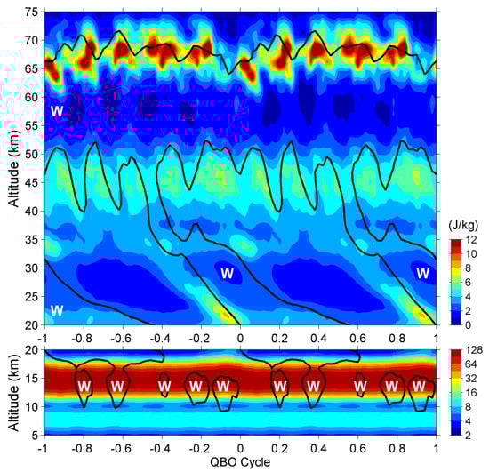 The drive of QBO is theoretically explained by the wave–mean flow interactions in the stratosphere [10,12,73]. Gravity waves propagate upward and are amplified with increasing altitude. When the waves meet the zonal wind with a flow velocity that is close to their phase velocity, the eastward-(westward-) propagating waves break around the westerly (easterly) shear, and produce a westerly (easterly) acceleration of the zonal wind. Both the zero-wind shears and the altitude where the waves break, named the “critical level”, will move downward as time progresses. Thus, waves drive the alternation of zonal wind direction, i.e., the zonal wind QBO (see literature [10,12,73] for a detailed explanation of the mechanisms of the stratospheric QBO). While waves break at the critical level in the lower stratosphere, the amplitude of the waves is amplified, and the wave energy observed here is significantly enhanced (see Figure 2 and Figure 4 for practical examples). However, at any time, some waves do not fit the wave breaking condition (i.e., do not meet their critical level). They are able to penetrate the zonal wind to reach higher altitudes. In general, considering the wave energy generated around the tropopause is a fixed value, the more the wave energy is dissipated or blocked in the lower atmosphere, the less it can propagate upward into the upper atmosphere. Therefore, EP–12 in the lower mesosphere shall be negatively correlated to that in the lower stratosphere.