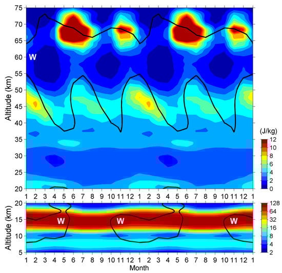 In this section, we report the EP distribution variability with time and altitude, i.e., the time-altitude intensity of EP. The values in the zonal direction are averaged and shown in Figure 2. The contour lines of zero zonal wind are also plotted to show the wave–mean flow interactions that affect the wave amplitudes [3,10,12,13]. The westerly shears of zonal wind are plotted using white contours without shadowing, while the white contours with magenta shadowing indicate the easterly shears of zonal wind. The figure can also be plotted using TIMED/SABER data. We have made a comparison between the ERA5 EP and TIMED/SABER EP in Supplementary Materials (Figures S1–S3 from the Supplementary Material).