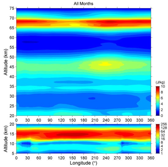 Figure 6 shows the longitude-altitude intensity of EP. Similar to Figure 4 and Figure 5, the values above and below 20 km altitude are plotted separately. All the values during the 41-year period were averaged to plot this figure.