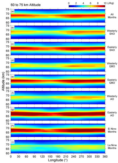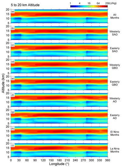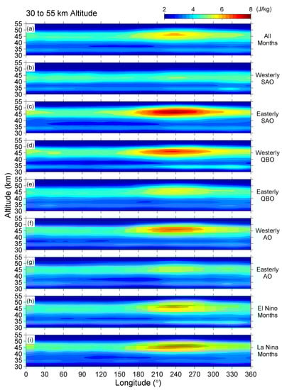 We have found the possible dependence of EP on the Niño 3.4 index from Figure 3. The result further inspired us to calculate the mean EP values by separating the 41-year period into El Niño/La Niña months as well as westerly/easterly months of the SAO, QBO, and AO. Figure 7, Figure 8 and Figure 9 are the plots of longitude-altitude intensity under different conditions of SST/zonal wind at 5–20 km (Figure 7), 30–55 km (Figure 8), and 60–75 km (Figure 9) altitudes. In these figures, the all-month averaged EP, as shown in Figure 6, is repeated in each figure in panel (a). The results under different phases (westerly or easterly) of the SAO, QBO, and AO are plotted in panels (b–g), whereas, the results during El Niño and La Niña months are plotted in the last two panels of (h) and (i), respectively.