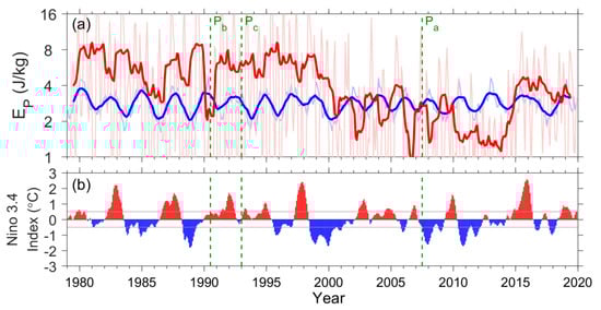 Secondly, EP has latitudinal variations. Kelvin waves significantly contribute to the equatorial EP [45,47,50], whereas convections play an important role in the tropical EP [43,44,47,48,50,51]. The mid- and high-latitudinal EP are usually very low but may be high during winter months due to the influences of extratropical and polar systems [46,50,51].