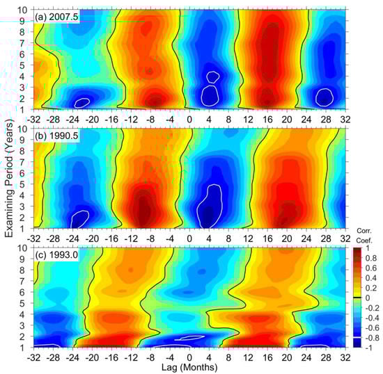 The correlation coefficients between the lower stratospheric and lower mesospheric EP–12, as functions of lag time and examining period centered over three epochs of (a) 2007.5, (b) 1990.5, and (c) 1993.0, respectively.