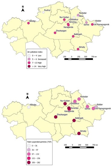 Air pollution index in 2019 (upper map) and average annual concentrations of TSP in the cities of Kazakhstan in 2019, µg m−3 (bottom map). Data source: [33].