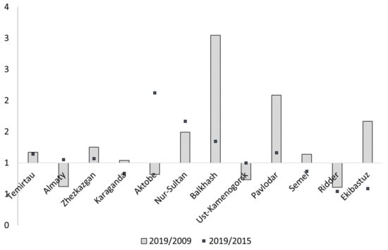 Changes in the air pollution index over 2015–2019 and 2009–2019 in the cities of Kazakhstan Source: [33].
