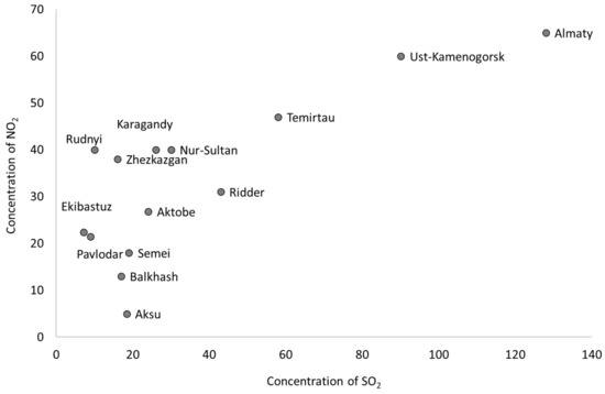 Average annual concentrations of SO2 and NO2 in cities in Kazakhstan in 2019, µg m−3. Data source: [33].