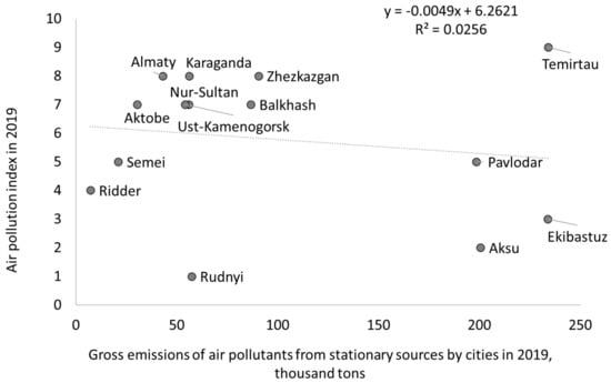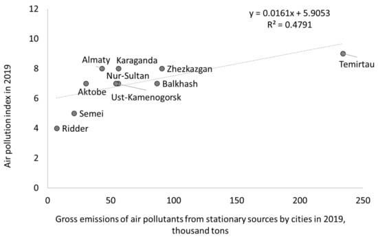 If we exclude four cities (Pavlodar, Ekibastuz, Aksu, Rudnyi) where industrial plants are located outside of the city and where there is a lack of monitoring stations, the situation is dramatically different (Figure 5). API level and gross emissions were correlated (R2 = 0.4791, p = 0.027) for the remaining ten cities, although the correlation was not strong. This could indicate a contribution of industrial emissions in the air pollution of the cities.
