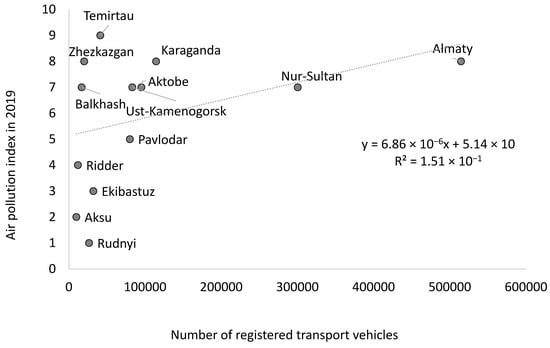 Selected cities, except for Almaty and Nur-Sultan, are small industrial cities. Seven cities (out of fourteen) have a low population (less than 179 thousand people) and have less than 41 thousand registered vehicles. The number of registered vehicles by cities was compared with the API in the selected cities (Figure 6). Transport in Almaty and Nur-Sultan could have a contribution to air pollution deterioration, while in other cities non-transportation sources may dominate in the contribution to air pollution. The correlation between the number of registered vehicles and API was low (R2 = 0.151, p = 0.189). Temirtau, Zhezkazgan, and Balkhash have high levels of air pollution, despite the very low population and fewer transport vehicles.