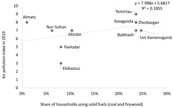 Coal combustion for household heating is also an important source of air pollution. The households Survey showed that solid fuels (coal and firewood) are mainly used by rural households: 55% of rural households in Kazakhstan used solid fuels and only 17% of urban households used solid fuels [40]. The data on the share of households using coal by cities were compared to with the Air Pollution Index by cities (Figure 7). It could be observed that despite the low share of households using coal in Almaty (1%) and Nur-Sultan (6%), those cities remain highly polluted. Generally in the selected cities, the share of households using coal was less than 25%. There is no available data for small cities such as Semei, Rudnyi, Aksu, and Ridder.