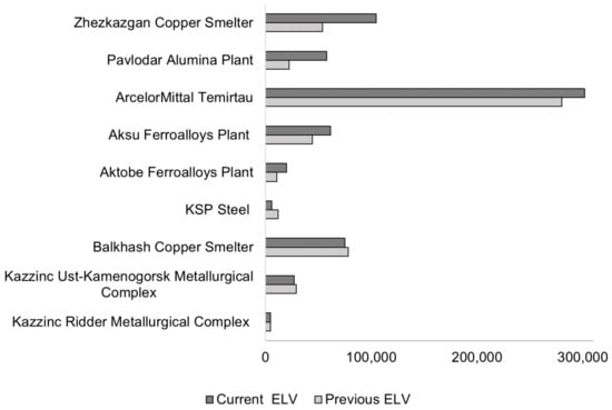 In the nine major metallurgical enterprises considered, there was an overall increase in ELV by 124 thousand tons per year (23% increase). A reduction in the ELV was observed for only three enterprises, totaling 11 thousand tons, while the ELV increased by 135 thousand tons for five enterprises (Figure 8).