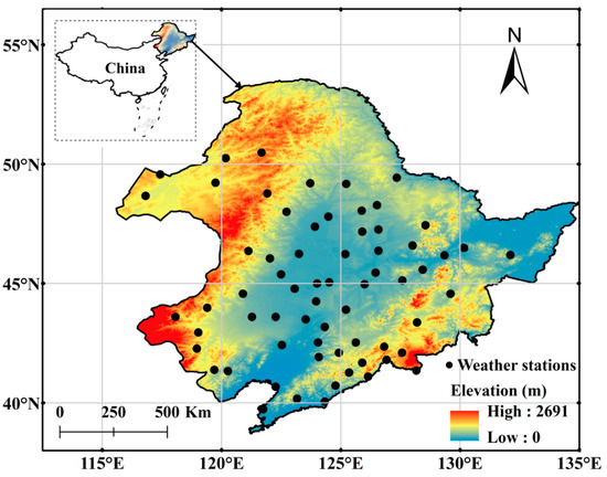 Geographical distribution of the 68 meteorological stations in northeast China.