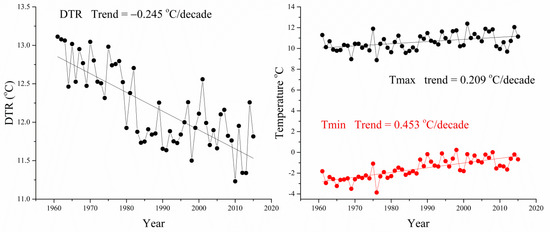 According to the Intergovernmental Panel on Climate Change (IPCC) Fifth Assessment Report (AR5), the global climate has warmed by about 0.74 °C in the last century [1]. The intensified warming contributes to a series of extreme climate events, such as droughts, floods, and heat and cold waves [2]. Diurnal temperature range (DTR), defined as the difference between the maximum temperature (Tmax) and the minimum temperature (Tmin), is a meteorological indicator related with global and regional climate change. Furthermore, it provides more information on climate change than mean temperature due to its relationship with Tmax and Tmin and its sensitivity to radiation energy balance change [3,4,5,6]. Therefore, DTR is considered as an important indicator and is receiving much more attention in regional and global scale in recent times [7,8,9,10]. Previous studies have reported that DTR changes were not uniform globally, which was attributed to complicated interactions of local climatic and anthropogenic factors [11,12]. In most parts of world, it is reported that DTR decreased with individual rate, such as in Bangladesh [13], Australia [14], and United States [15]. However, an increase of DTR was reported in India [16]. Because DTR change is different indifferent regions, investigating the DTR change at regional scale is necessary for understanding the global climate change.