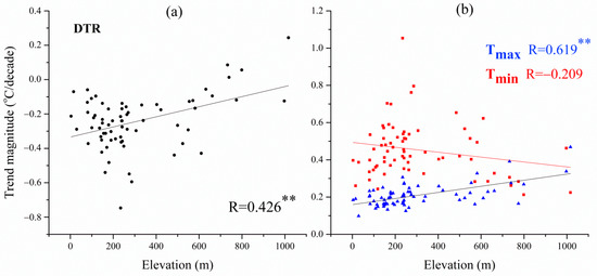 Elevation is one of the factors influencing the distribution of temperature trend. Therefore, for the distribution of DTR trend, we mainly analyzed the influence of elevation on temperature trend. The correlation coefficient was used to estimate the relationship between temperature and elevation.