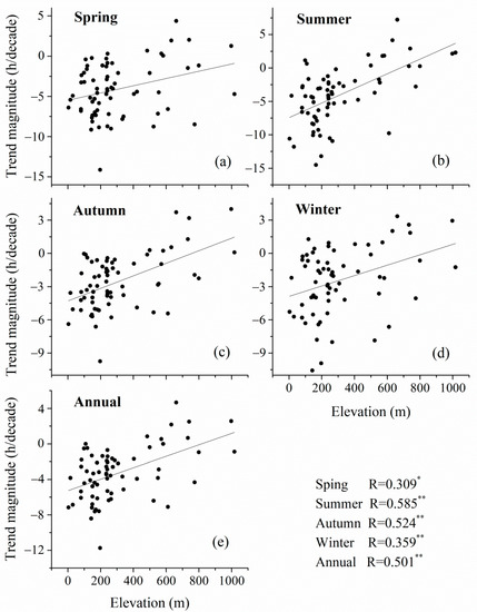 The relationship between the sunshine duration trend and elevation at seasonal (a–d) and annual (e) scales in northeast China during 1961–2015. “SD” represents sunshine duration. * Significant at p < 0.05, ** Significant at p < 0.01.