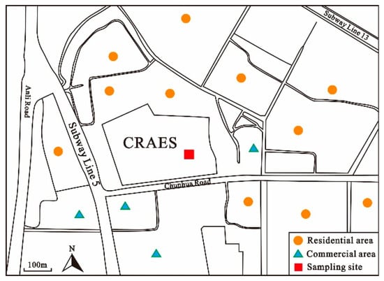 The sampling site was located at the Supersite for Urban Air Comprehensive Observation and Research at the Chinese Research Academy of Environmental Sciences in Chaoyang District of Beijing (40°02′28″ N, 116°24′46″ E) (Figure 1). It is about 15 m above the ground and surrounded by residential areas and commercial–residential areas. There are no obvious local industrial pollution sources. Therefore, it is representative for studying the ambient air pollution status of typical urban areas in Beijing.