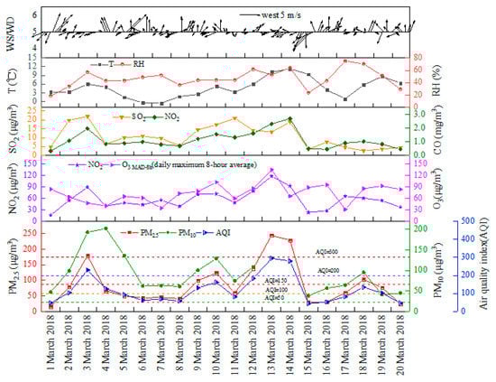 During the monitoring period, the monitoring data of conventional pollutants were obtained from the site of Beijing Olympic Sports Center in the National Ambient Air Quality Monitoring Network []. The site is located in Chaoyang District of Beijing. Its building configuration and pollutant analysis methods strictly comply with the national technical regulations. Furthermore, the ambient air quality monitoring data can reflect the air quality around the monitoring site. PM10 data are missing on 13 and 14 March 2018. Meteorological data such as temperature (T), relative humidity (RH), and wind speed during the monitoring period were obtained from Beijing Nanyuan Airport Station in the Global Weather Precise Forecast Network [].