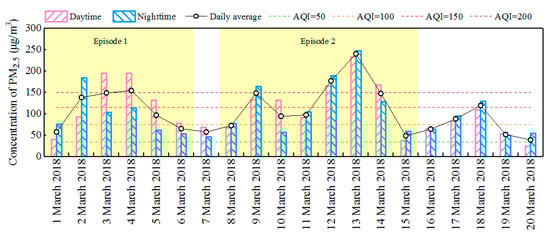 During the whole monitoring period, the daily mean mass concentrations of PM2.5 in ambient air in the study area ranged from 40 to 241 μg/m3, with an average of 106 μg/m3 (Figure 3). The daily mean concentrations of PM2.5 were less than the limit (75 μg/m3, 24 h, GB 3095-2012) in only 6 days. The mass concentration of PM2.5 ranged from 25 to 234 μg/m3 with an average of 109 μg/m3 in the daytime, while it ranged from 46 to 248 μg/m3 with an average of 103 μg/m3 in the nighttime (Figure 3). The mass concentrations of PM2.5 in the daytime were obviously higher than those in the nighttime in 8 days and significantly lower than those in the nighttime in 11 days (Figure 3).