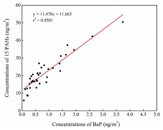 Linear relationship of 15 PAHs and benzo[a]pyrene (BaP) in the study area during the monitoring period.