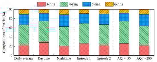 During the monitoring period, the proportions of daily mean mass concentrations of PAHs with different ring numbers in the study area were: 4-ring PAHs (43%) > 3-ring PAHs (24%) > 5-ring PAHs (23%) > 6-ring PAHs (10%) (Figure 5). There was a significant difference in the composition of PAHs between daytime and nighttime. In the nighttime, the proportion of 5-ring and 6-ring PAHs increased significantly by 8.8% and 3.3% on average, respectively, while the proportion of 3-ring and 4-ring PAHs decreased by 8.0% and 4.1% on average, respectively. During the two heavy air pollution episodes, the proportions of daily mean mass concentrations of PAHs with different ring numbers did not change significantly. When AQI < 50 (1 and 20 March) and AQI > 200 (3, 13, and 14 March), there was a significant difference in the composition of PAHs in PM2.5. When AQI > 200, the proportion of 5-ring and 6-ring PAHs increased significantly by 12% and 4.5%, respectively; the proportion of 3-ring and 4-ring PAHs decreased by 7.8% and 8.2%, respectively.