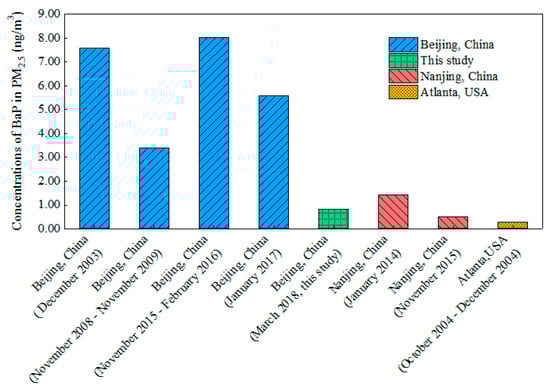The average value of daily mean BaP mass concentration in PM2.5 during the monitoring period was 0.82 ng/m3, significantly lower than that during the heating periods of Beijing in 2003 [], 2008, and 2009 [], 2015 and 2016 [], and 2017 [] (Figure 6), lower than that observed at the monitoring site of Jiangsu Academy of Environmental Sciences in the winter of 2014, higher than that observed at the monitoring site of Jiangsu Environmental Monitoring Center in the winter of 2015 [], and significantly higher than that observed in Atlanta, USA, in the winter of 2004 []. The results show that the BaP mass concentration in PM2.5 in this study is decreasing, but still relatively high.