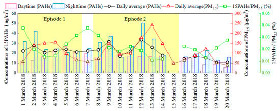 Nineteen days of complete monitoring were conducted in the study area. The mass concentrations of 15 PAHs were higher in the nighttime than those in the daytime for 15 days (Figure 7). On 1–4, 7–9, 11–13, 16–20 March, the relative humidity was higher in the nighttime than that in the daytime, and the temperature was slightly lower than that in the daytime. Therefore, PAHs were more likely to adsorb on the surface of PM2.5 in the nighttime. As a result, the mass concentration of 15 PAHs was higher in the nighttime than that in the daytime. On 5 and 10 March, it was cloudy, with southerly or southwesterly winds dominating in the daytime. The meteorological conditions were relatively stable, which was not conducive to the diffusion of pollutants. As a result, the mass concentration of PAHs during the daytime was higher than that in the nighttime in these two days. On 6 and 14 March, the mass concentration of PAHs showed little diurnal difference, with a difference of less than 1 ng/m3; and the diurnal difference of mean temperatures was not obvious. The south wind or southeast wind was dominant on 6 March and the east wind or northeast wind was dominant on 14 March. The relative humidity during the same period of the two days was higher than that in other monitoring days (except for heavy atmospheric pollution days), and PAHs were more likely to adsorb on the surface of PM2.5, which affected the mass concentration of 15 PAHs in PM2.5.