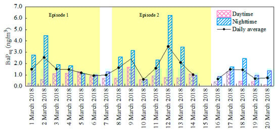 Daily and diurnal variation of BaP equivalent concentration (BaPeq) mass concentrations in PAHs during the monitoring period.