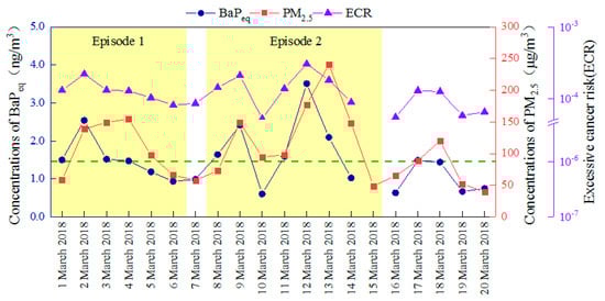 Variation of BaPeq, PM2.5, and excessive cancer risk (ECR) in the study area during the monitoring period.