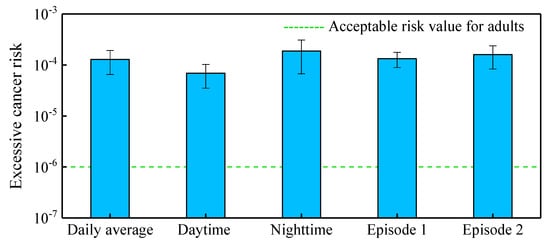 The ECRs of 15 PAHs in the study area ranged from 5.3 × 10−5 to 3.1 × 10−4, with a mean of 1.3 × 10−4, which was higher than the acceptable risk value (1 × 10−6) (Figure 9). Although this value was lower than that of northern Chinese cities such as Taiyuan (2.0 × 10−3) [], it was higher than those of southern Chinese cities such as Nanjing (1.07 × 10−5) [], New Zealand (2.1 × 10−5), and Japan (4.6 × 10−5) []. As the concentrations of PM2.5 and BaPeq became higher, the ECR became higher too (Figure 9). The ECRs of PAHs in the daytime and nighttime were 6.9 × 10−5 and 1.9 × 10−4, respectively (Figure 10). Although the daytime value was low, it was still greater than 10−6 (Figure 10). During the two heavy air pollution episodes, the ECRs of PAHs were 1.3 × 10−4 and 1.6 × 10−4, respectively. The ECRs of PAHs were higher in heavy air pollution episodes than that in non-heavy air pollution episodes, and significantly higher than the acceptable risk. Effective measures should be taken in Beijing to protect human health.