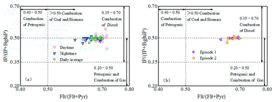 Variation of fluoranthene (Flt)/(Flt + pyrene (Pyr)) and indeno [1,2,3-cd] pyrene (IP)/(IP + benzo[ghi]perylene (BghiP)) during the monitoring period: (a) Flt/(Flt + Pyr) VS. IP/(IP + BghiP), (b) Flt/(Flt + Pyr) VS. IP/(IP + BghiP).