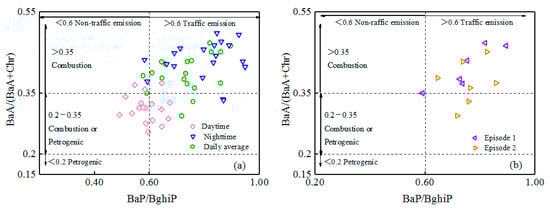 Variation of BaP/BghiP and BaA(BaA + Chr) during the monitoring period: (a) BaP/BghiP VS. BaA/(BaA + Chr), (b) BaP/BghiP VS. BaA/(BaA + Chr).