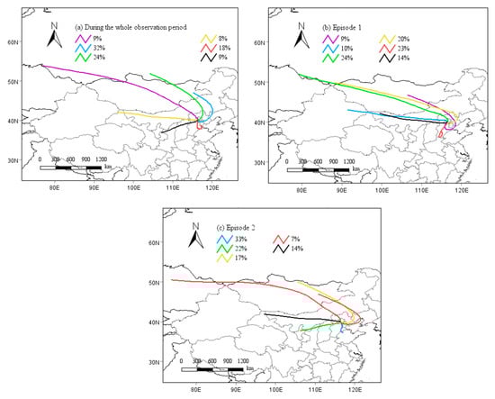 Backward trajectory clustering analysis in the study area: (a) during the whole observation period, (b) episode 1, (c) episode 2.