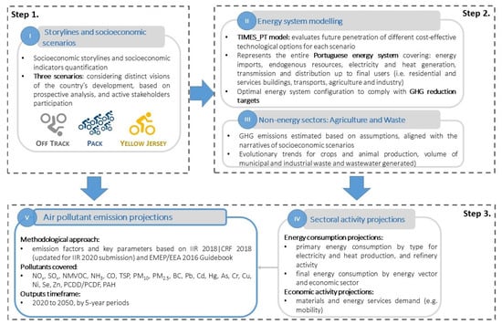 Projecting the effects of carbon neutrality pathways on air pollutant emissions required multiple tasks, which may be divided in three main steps: (i) the development of socioeconomic scenarios; (ii) the estimation of greenhouse gas emissions, and (iii) the estimation of air pollutants emissions (Figure 1). The two first steps were developed under the CNR2050 methodology, having as a starting point the development of coherent socioeconomic scenarios, based on narratives of possible developments of Portuguese society, up to 2050. These scenarios have been widely discussed with several stakeholders and their main socioeconomic drivers (e.g., GDP growth, demography) have been validated by public entities such as the Bank of Portugal, Ministries of Economy, and Finances and the National Statistics Office.