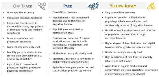 Three distinct core socioeconomic scenarios have been designed, describing different visions of the country’s development (e.g., production profile, population evolution, spatial planning, energy, and climate policy). The configuration of these different trajectories resulted from prospective analysis, based on macroeconomic, demographic, and technological scenarios, and also on active participation of several stakeholders from different fields of expertise. The prospective analysis was focused on: (a) energy system, including buildings, industry, and transports and mobility; (b) agriculture, land use, and forests; and (c) waste, being also considered options, and different integration levels, of circular economy features (transversal to most economic sectors).