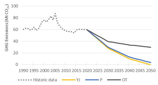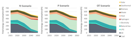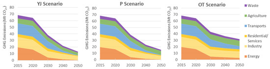 The three scenarios show changes in final energy consumption, up to 2050, within each sector and by fuel type (Figure 5 and Figure 6). The effect in total GHG emissions by sector is depicted in Figure 7. The following analysis is focused mainly in the YJ scenario due to its higher socioeconomic and energy system related activity, providing ambitious impact relevance to air pollutant emission reduction objectives.