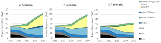 In all three scenarios the predominance of renewable energy sources for electricity generation (RES-E), with solar PV and wind increasing their representativeness in the electricity source mix, was evident (Figure 4). The RES-E is a cost-effective solution, even if no GHG emission target is considered (OT scenario). Additionally, in the YJ and P scenario, where the final energy demand increased and was significantly electrified (Figure 6), RES-E maintained their contribution and ensured carbon free electricity consumption.